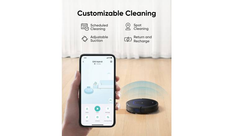 eufy G50 Hybrid Robot Vacuum with 4,000Pa Strong Suction, Dynamic Navigation, Pro-Detangle Comb, Roller Brush, Mop Pad for Light Surface Cleaning, Ideal for Pet Hair, Hard Floors, Carpet. G50 connects to your phone via Bluetooth so that you can schedule cleaning times and start spot cleaning via the eufy app.