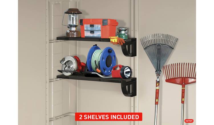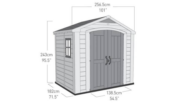 The Keter Factor Apex 8×6 shed is made from durable resin so it is built to last. Complete with wide double doors, the 8×6 is ideal for storing larger garden equipment and tools. The shed features a window and skylight for additional daylight and built-in ventilation. It also includes two shelves and brackets, and a heavy duty floor. Weather resistant and easy to assemble using household tools. External Dimensions: W: 256.5cm, D:182cm, H:243cm, Footprints: 248cm x 178cm.